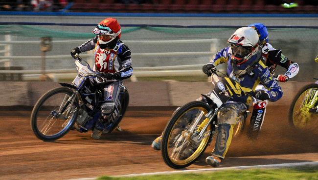 Hopwood’s second race win of the evening in heat 12 ensured the Kings recovered equality after the crippling disappointment of Thomas losing the lead in the previous race due to a misfiring machine and so with three heats to go it was dead level again. Heat 13 saw Thomas trap brilliantly this time but his skipper Bowen was trailing. Kent’s ‘Captain Marvel’ did all he could to get back on terms but overcooked it tumbling off on the second lap. Remounting in hope of a slip up giving him points, Bowen trailed in last but his young team mate Thomas had the three points: still level at 39-39.